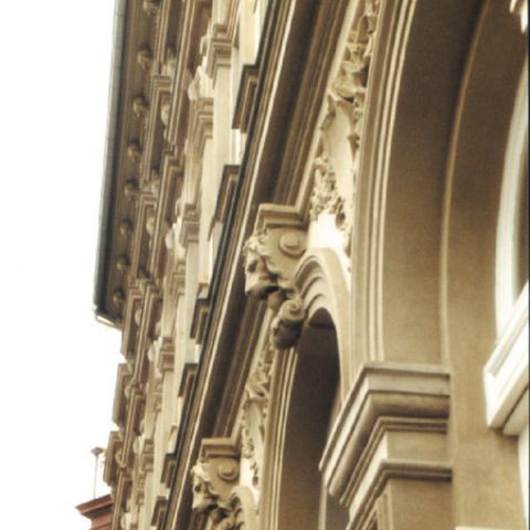 Das mit reichhaltigen neo-klassizistischen Schmuckelementen aus Sandstein verzierte Gebäude, wurde ca. in der Mitte des Jahrhunderts mit einer weißen Farbe überstrichen. Was zur Folge hatt, dass dem Sandstein die notwendige Belüftung genommen wurde und dieser unter dem Anstrich zerfiel. Nur mit Unterstützung der Denkmalpflege gelang es das Dach und die Fassade in Ihre alte Pracht zurück zu versetzen. 80% des Sandsteins mußten nach- und aufgearbeitet, oder in Teilen neu erstellt werden.