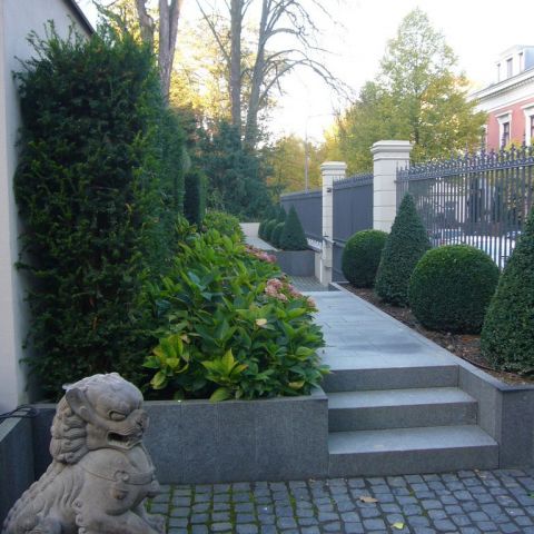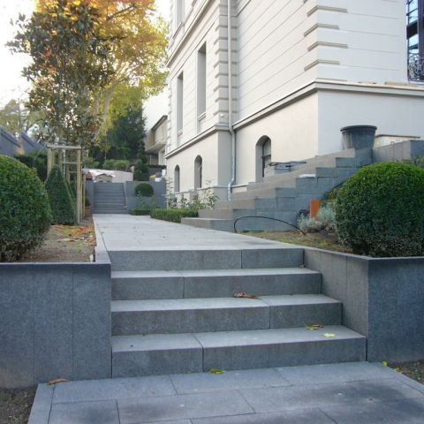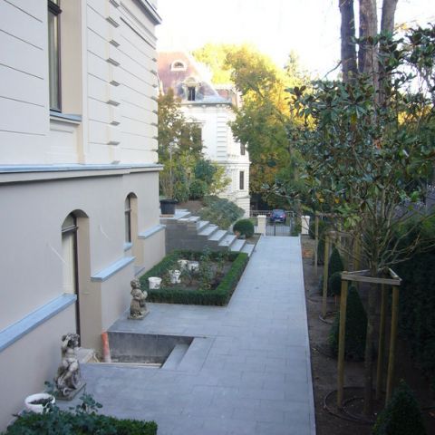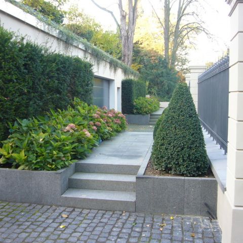 In das ansteigende Gelände wurde eine großzügige Tiefgarage mit internem Zugang in die Villa eingebaut. Im Zusammenhang mit der Baugenehmigung wurde von der örtlichen Bauaufsichtsbehörde die Auflage erteilt, die Tiefgarage in die Gartengestaltung einzubinden. Ziel sollte sein, dass die Tiefgarage durch Abstufen und Einbinden des Geländes und durch intensive Begrünung deutlich an Dominanz verliert.