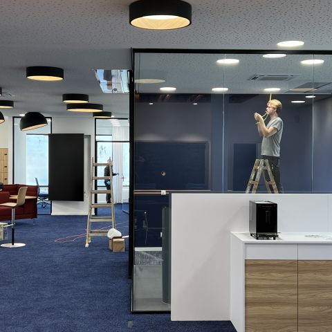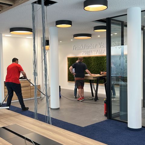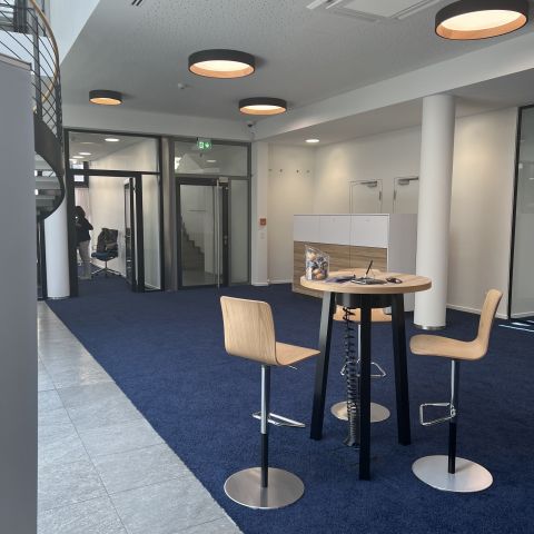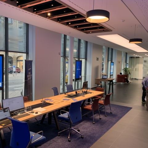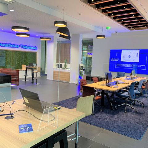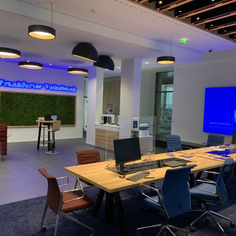 Sinnbildlich für die neue Angebotswelt stehen die jetzt – heute – dem Kundengeschäft übergebenen Filialen der Zukunft. Zunächst in der Börsenstraße und in der Schweizer Straße sowie in der Reichsburgstraße Rödelheim ist die neue Angebotswelt der Frankfurter Volksbank auch sichtbar und spürbar. Das lichte und leichte Design der neuen Filialen, unterstreicht dabei auch die neue Beratungskultur „Auf Augenhöhe“. Schalter und tradiertes Design wurden gegen einen fünf Meter langen Tisch ausgetauscht, an dem jetzt die Erst-Kommunikation stattfinden wird. Smarte Bildschirme in den Besprechungsräumen unterstützen die Transparenz der Beratung.